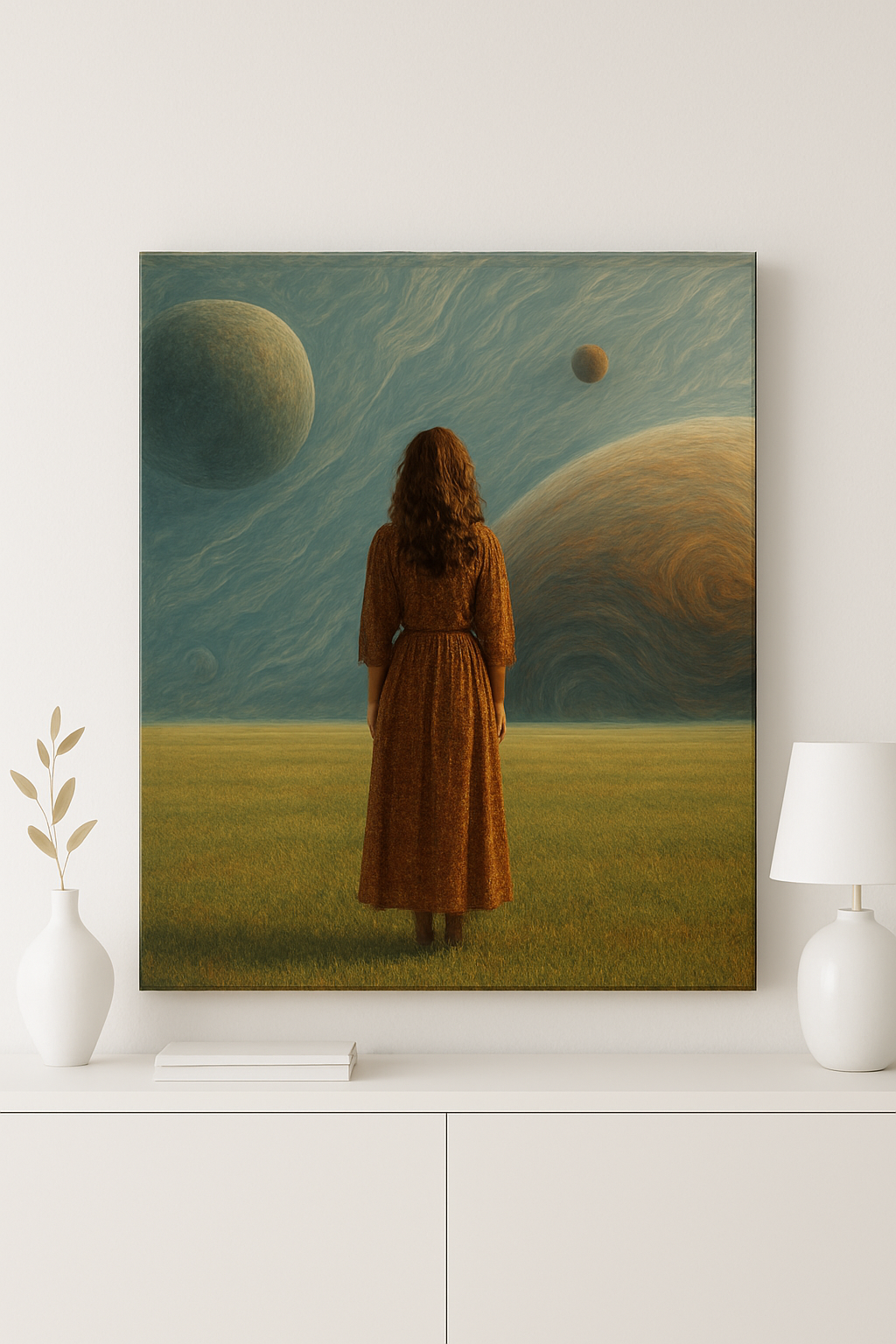 Why art? Let my try. A man arrives home after a difficult day at work. The boss, the economy, politics depressing his mood, his wife with a mellow smile. He sits down on the couch with a glass of wine. he looks up and see the new canvas art print they have bought the previous day against the wall. Yes, that wall was boring. Now, something happened here. The art print drifting to his soul. Or the other way round. Something substantial sails into his soul. Calming, intriguing, depth of deeper life cyphering into misty mood. A slow smile coming to his mouth. His wife enters. she senses a happening, sitting down besides him. "it's good", she says. "it's good", he says. They start to talk. Like real talk. Why art? Art ties the soul. Dresses the inner moon.  Yes, and that office wall at reception can also do a bit of motivating if nursed!
